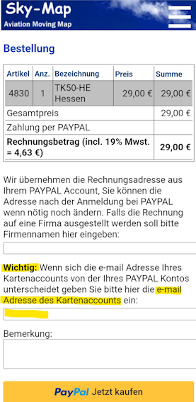 Während des Bestellvorgangs haben Sie die Möglichkeit, eine von PayPal abweichende E-Mail-Adresse anzugeben – nämlich die des gewünschten Sky-Map-Benutzerkontos/Kartenaccounts. So wird die Karte automatisch dem richtigen Account zugeordnet.