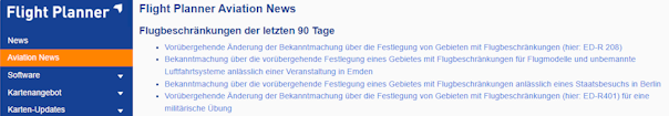 - Liste der NfL (Nachrichten für Luftfahrer) mit Flugbeschränkungen der letzten 90 Tage.